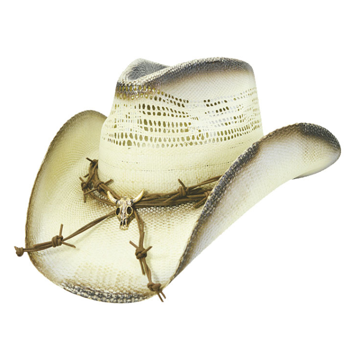 Pinched Front, tea stained bangora w/barbwire leather hb w/metal skull