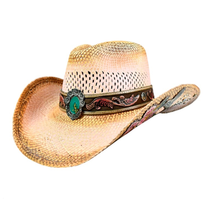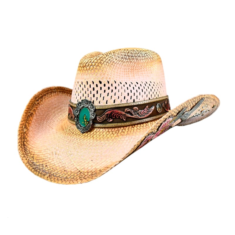 Pinch Front, panama straw, vented, pink tea stain, tooled leather. flowers & humming bird, w/metal studs, matching hb w/turquoise oval concho