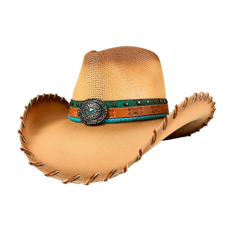 Tea Stain, Pinch Front Panama w/leather hb, turquoise & silver tooled concho, w/brown stiching around the brim
