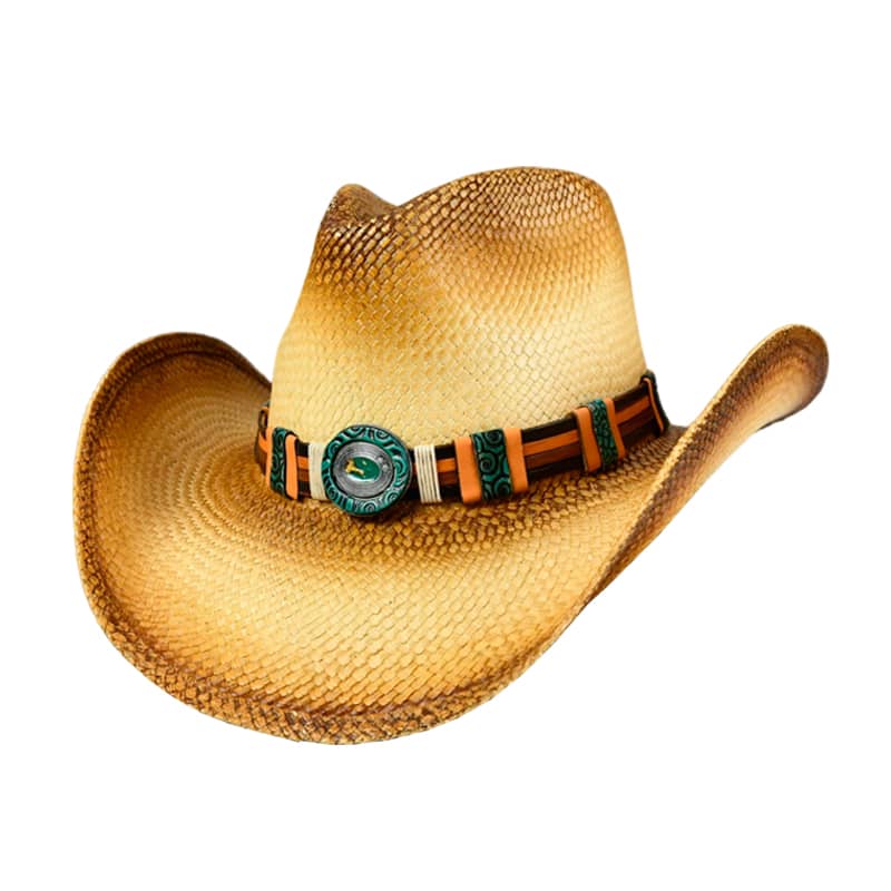 Tea Stain, pinch front panama w/leather hb & turquoise concho