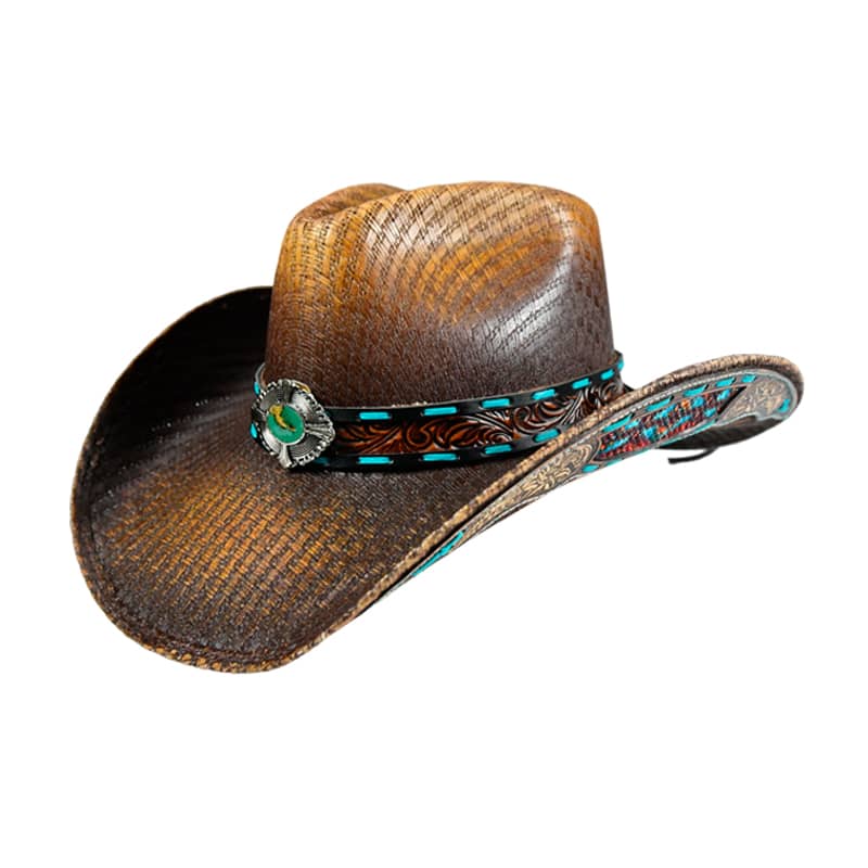 Pinch Front, brown straw, tooled turquoise leather applique on brim, w/matching hb & large oval concho